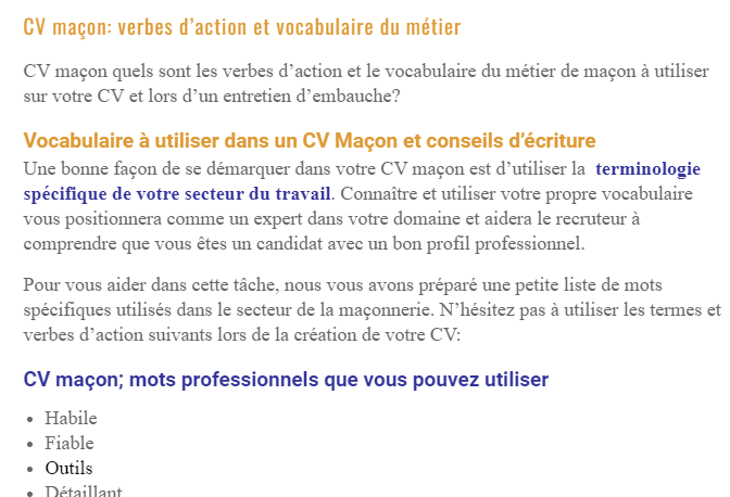 Pour vous aider dans cette tâche, nous vous avons préparé une petite liste de mots spécifiques utilisés dans le secteur de la maçonnerie. N’hésitez pas à utiliser les termes et verbes d’action suivants lors de la création de votre CV:
